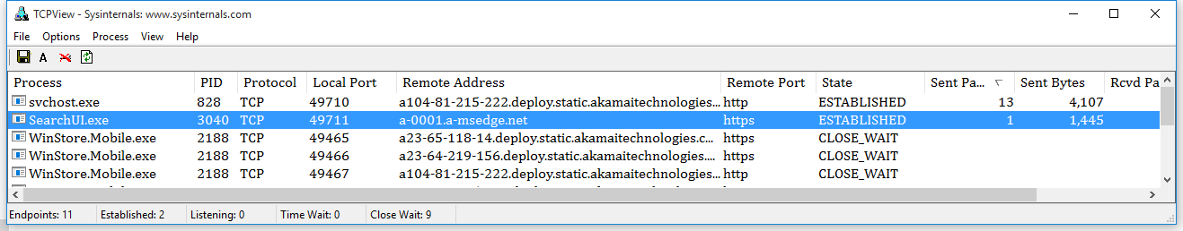 Спящие службы можно ждать долго. Пора пробудить их и проявить немного активности. Нажатие кнопки «Пуск» заставило ожить инфоблоки справа. Появился прогноз погоды, начали отображаться новости и реклама. TCPView показывает, что всё это грузится через сеть Akamai и выглядит легитимно. Как только мы запускаем «Блокнот» и начинаем набирать текст, картина сразу меняется.
