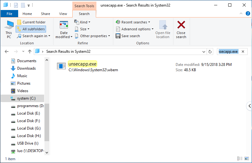 The genuine unsecapp.exe file should be located in C:WindowsSystem32 folder (normally C:WindowsSystem32wbem), it is the genuine one. You can search if the unsecapp.exe is in the System32 folder by using the search box. If it is, the unsecapp.exe file on your PC is not a virus.