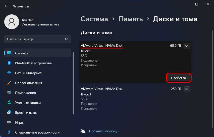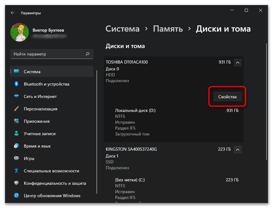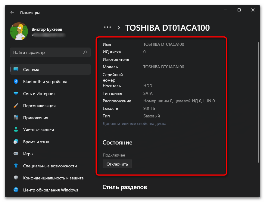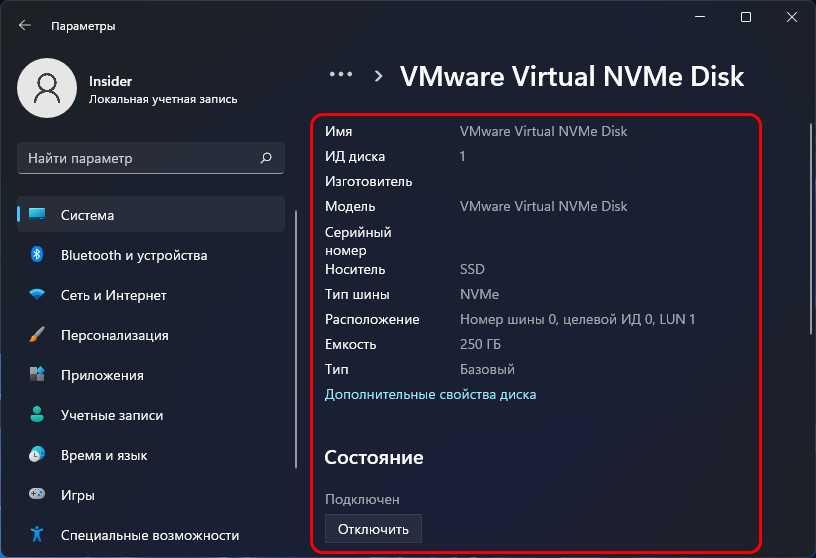 В свойствах указываются разные технические данные дисков. Если это диск не тот, на котором установлена Windows 11, для него будет доступна кнопка отключения.
