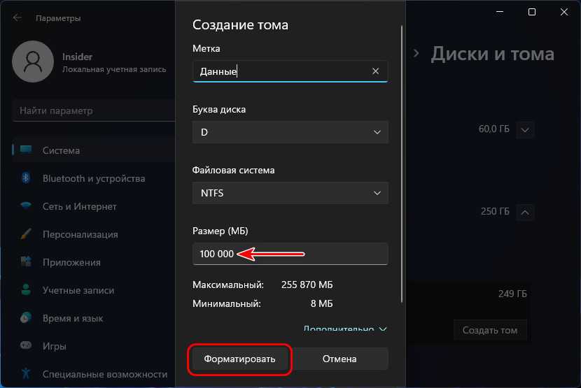 В графе «Размер (Мб)» нужно указать размер создаваемого раздела. Мы либо оставляем всё свободное место, либо указываем в Мб только часть, чтобы остальную часть потом распределить между другими разделами. Жмём «Форматировать».
