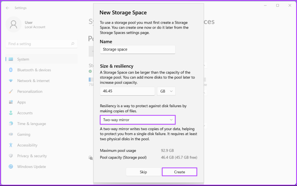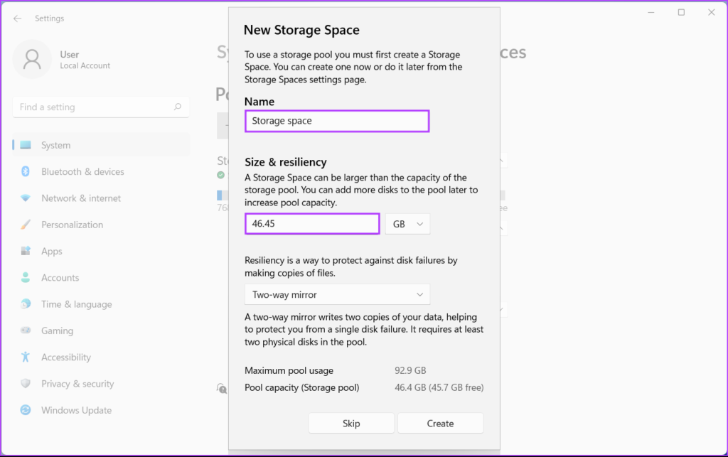 Затем Windows создаст пул хранения, объединив несколько дисков вместе. Кроме того, Windows попросит вас создать из него Storage Space, чтобы включить механизм защиты данных.