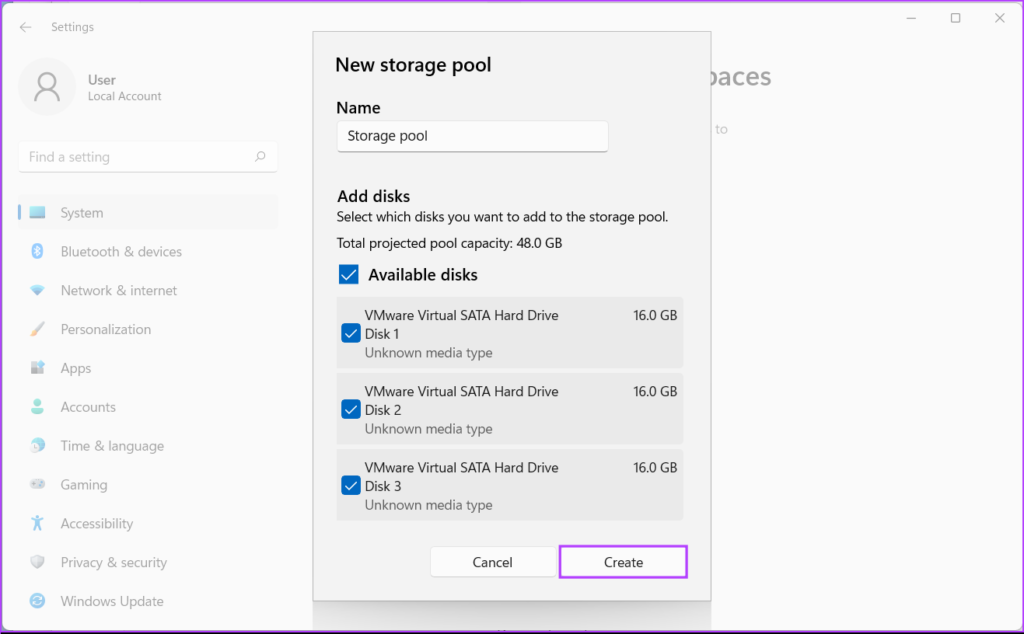 Шаг 6: После присвоения имени пулу носителей и выбора соответствующих дисков нажмите «Создать».