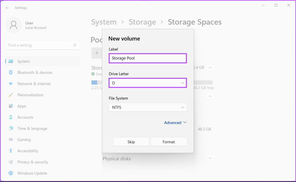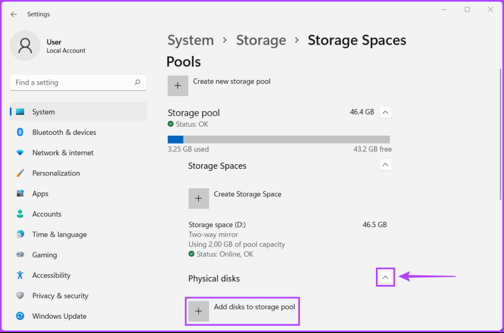 После того, как вы нажмете «Формат», в проводнике должен появиться новый раздел диска с буквой D. Между тем, если диск выходит из строя или вы хотите расширить пространство для хранения, добавив новый жесткий диск, вы можете легко щелкнуть раскрывающийся список «Физические диски» и нажать кнопку «Добавить диски в пул хранения».