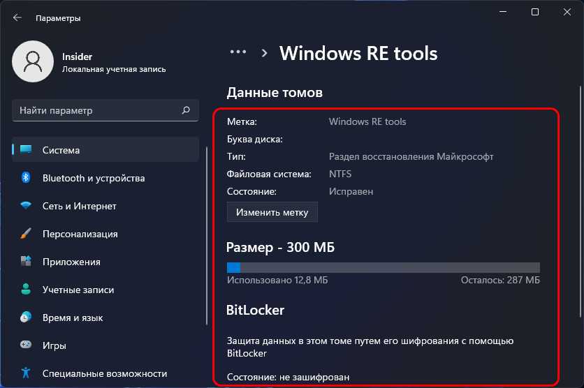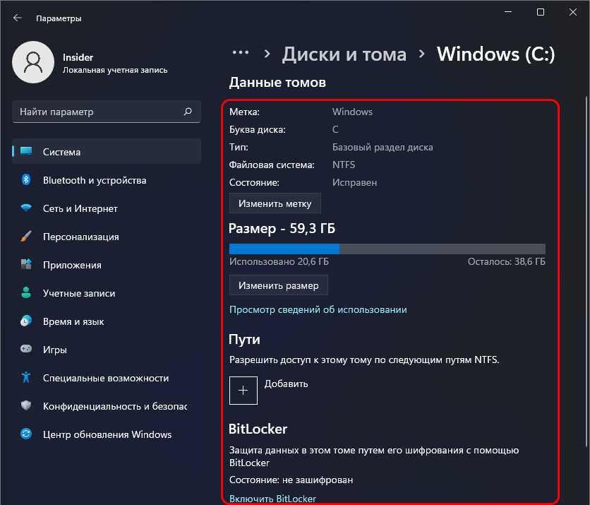 Для системного раздела С нам будут доступны кое-какие операции: изменение размера и метки, добавление путей NTFS, включение шифрования BitLocker (в редакциях Windows 11 не ниже Pro).