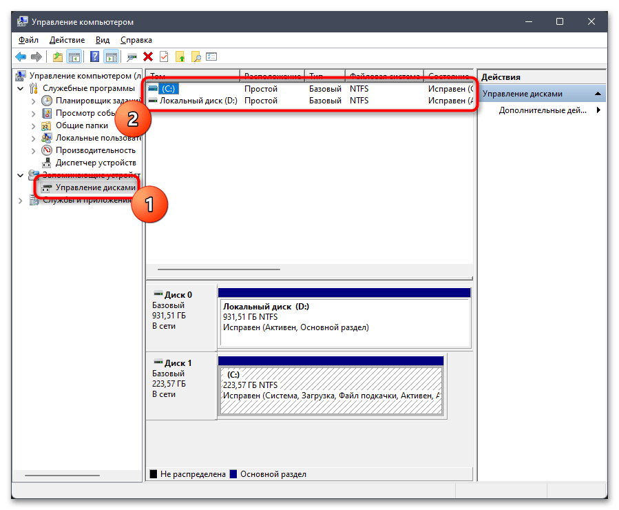 Теперь остается только раскрыть категорию «Управление дисками», выбрать физический носитель и приступить к выполнению необходимых действий.