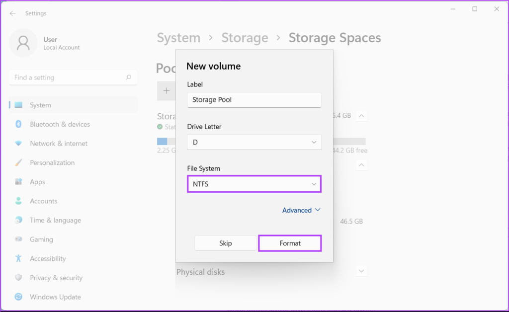 - Выберите ReFS (Resilient File System), если вы планируете использовать пространство для хранения больших объемов данных с улучшенной защитой данных от повреждения.