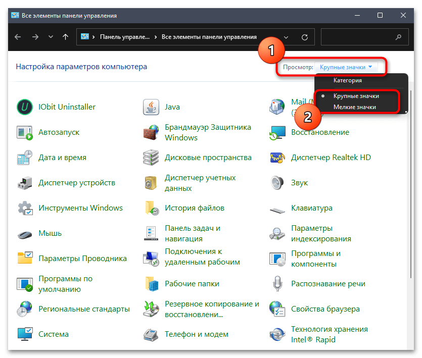 В новом окне разверните список «Просмотр» и выберите один из вариантов отображения значков.