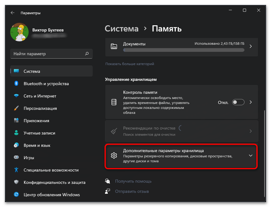Прокрутите список настроек и щелкните по пункту «Дополнительные параметры хранилища».