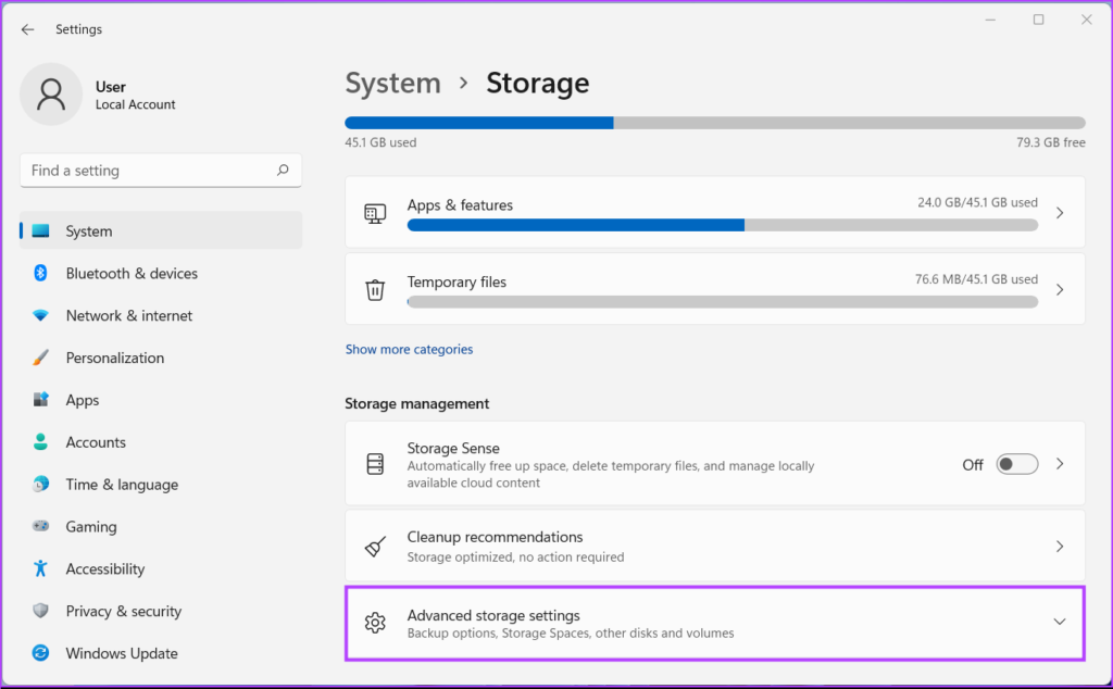 Шаг 2: На экране «Хранилище» щелкните раскрывающийся список «Дополнительные параметры хранилища».