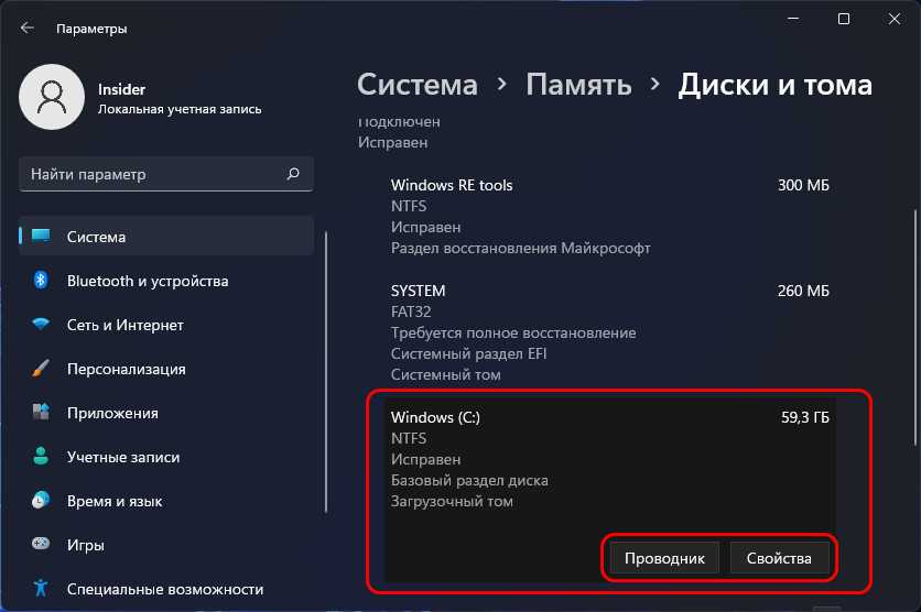 Для разделов доступны кнопки открытия в проводнике и отображения свойств.