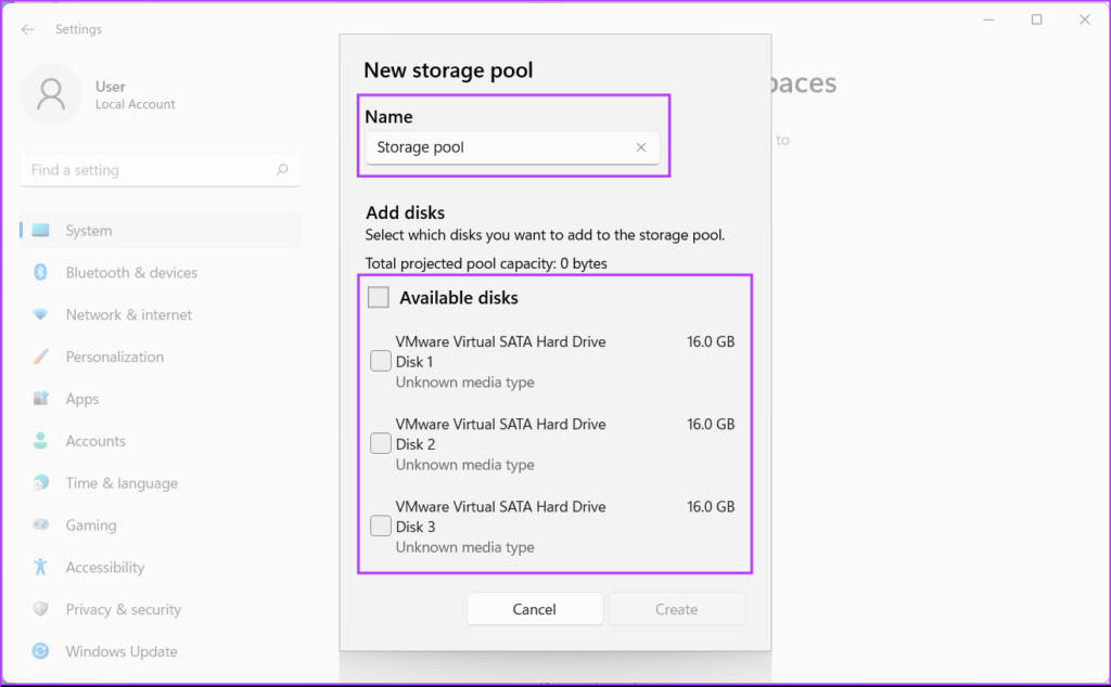 Шаг 5: Введите имя пула хранения, щелкнув текстовое поле под именем. Затем выберите диски, которые вы хотите добавить в пул.
