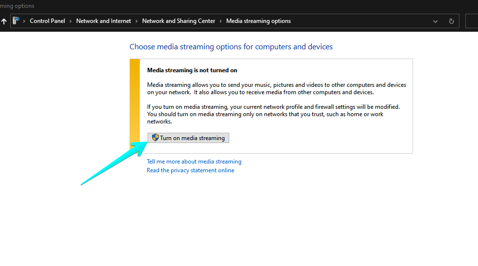 You can see that there is no mention of the term DLNA. However, this functionality is fully DLNA compliant. Accordingly, just click on Turn on media streaming.