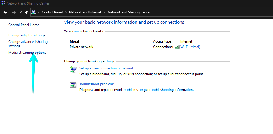 - On the ‘Network and Sharing Center screen, select ‘Change advanced sharing settings on the left menu.