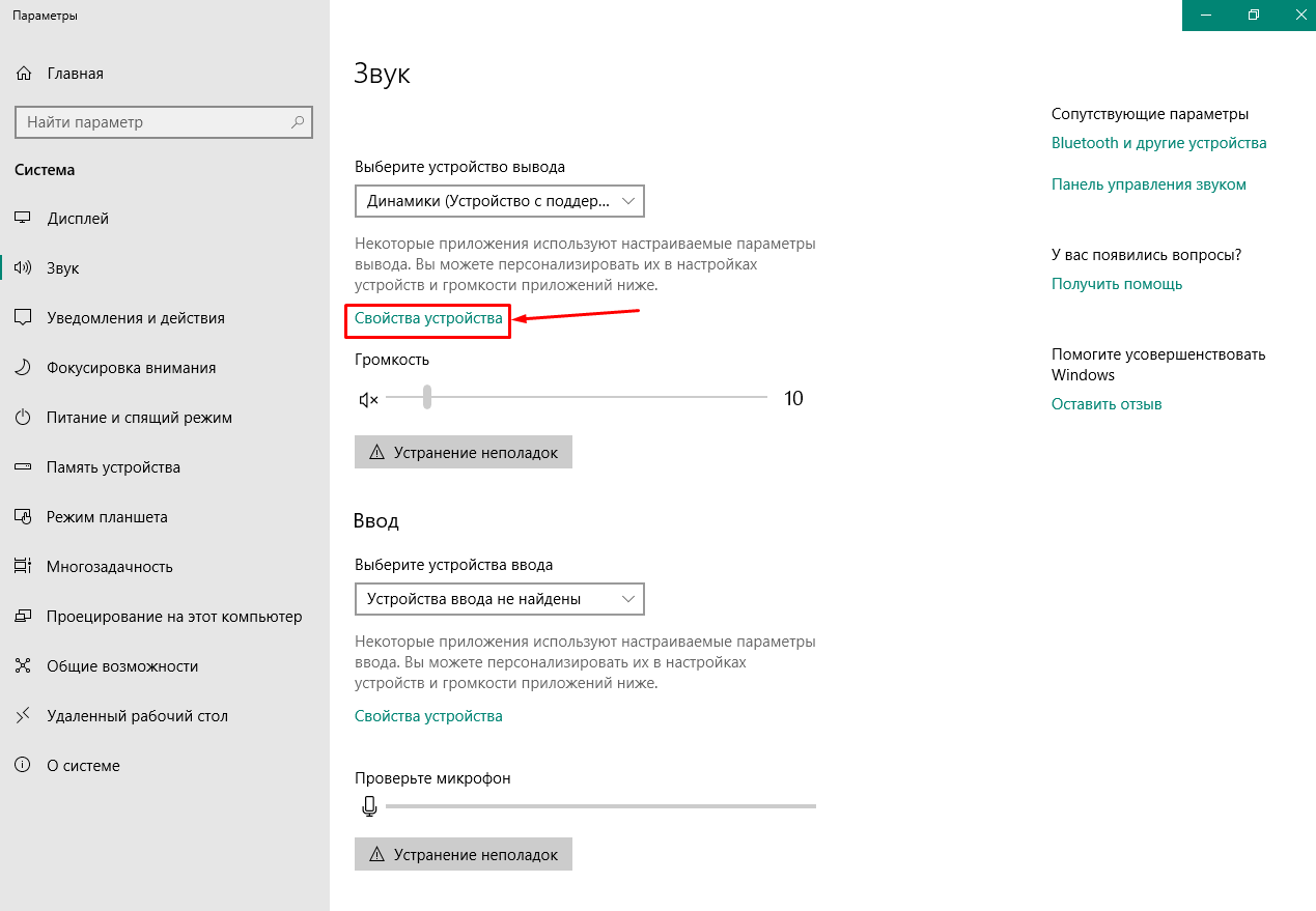 Это действие открывает полноэкранное окно, в котором, как на скриншоте, нужно нажать строку «Свойства устройства».