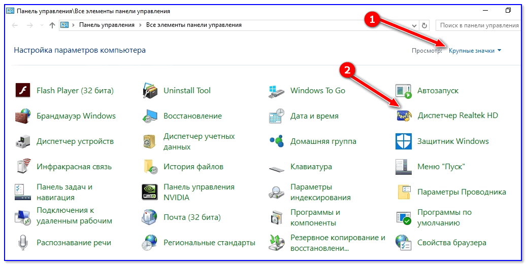 После перезагрузки, рекомендую сразу открыть панель управления, перевести режим отображения в «Крупные значки» и посмотреть, появилась ли ссылка на диспетчер Realtek (в моем случае, после установки версии 2.81 — все заработало!).