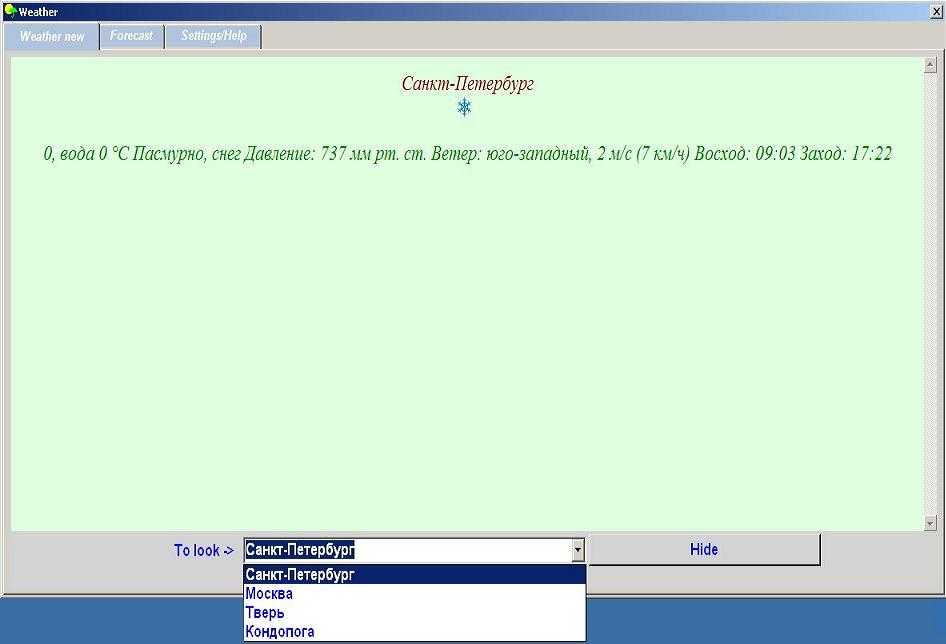 «Программа обновлена dd.mm.yyyy) ИЛИ ЛУЧШЕ СООБЩИТЬ АВТОРУ О ТОМ, ЧТО ПРОГРАММА ПЕРЕСТАЛА ОТОБРАЖАТЬ ПОГОДУ.