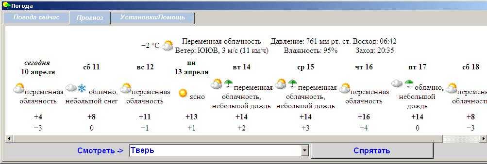 Закладка «Прогноз» позволяет смотреть прогноз погоды на 10 дней. Просмотр