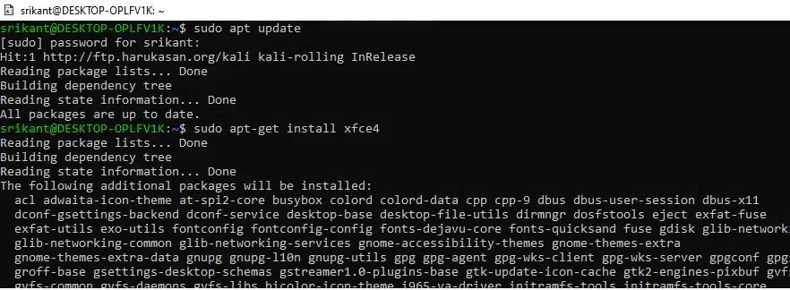 Затем запустите sudo apt-get install xrdp и sudo apt install kali-desktop-xfce xorg xrdp для установки xrdp.