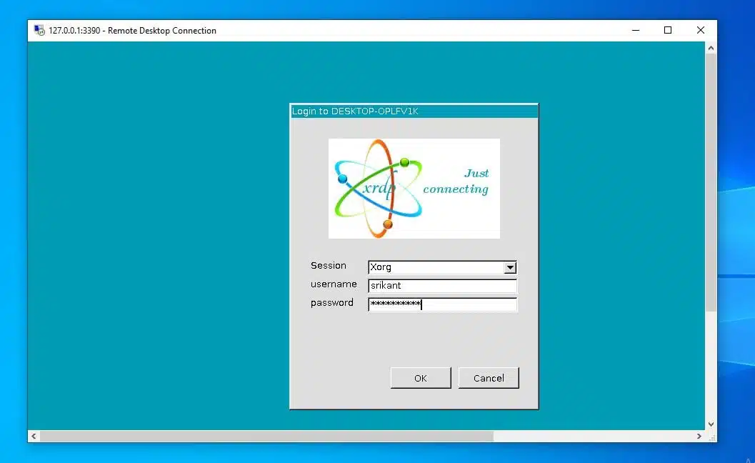 You should now see a new login window. Ensure the Session is set to Xorg and enter your Kali Linux username and password, then click the OK button.