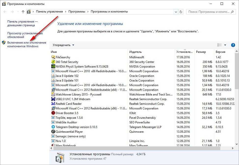 Тут перед нами предстает утилита для удаления программ, но через нее так же можно устанавливать компоненты системы, для этого нужно нажать в левом меню на пункт ВКЛЮЧЕНИЕ ИЛИ ОТКЛЮЧЕНИЕ КОМПОНЕНТОВ WINDOWS: