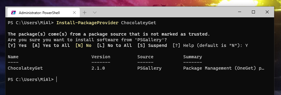 Install-PackageProvider: Administrator rights are required to install packages in ''. Log on to the computer with an account that has Administrator rights, and then try again, or install in 'C:\Users\MiAl\AppData\Local\PackageManagement\ProviderAssemblies' by adding "-Scope CurrentUser" to your command. You can also try running the Windows PowerShell session with elevated rights (Run as Administrator).