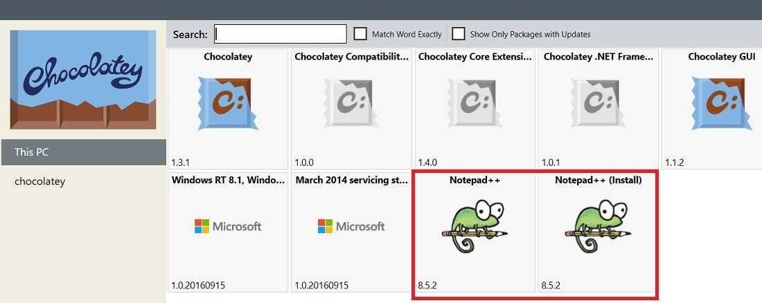 - Чтобы найти свои программы, которые можно обновить через Chocolatey, перейдите в «Этот компьютер» и установите флажок «Показывать только пакеты с обновлениями». Если он говорит «Подходящие пакеты не найдены», ни одна из программ не требует обновления в это время.
