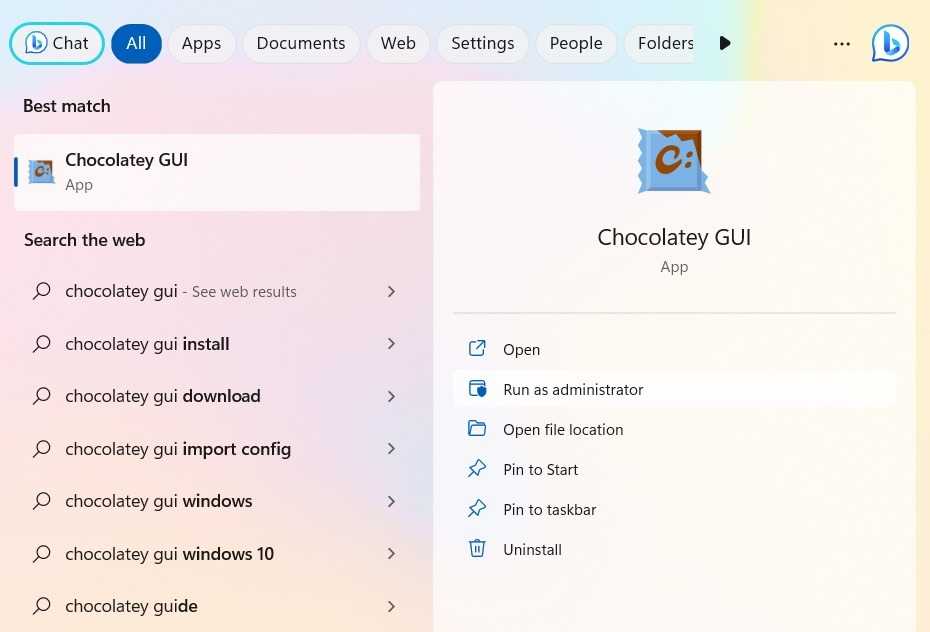 - После установки вы можете искать Chocolatey GUI в окне поиска Windows. Лучше запускать приложение от имени администратора.
