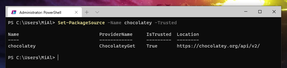 Сделайте Chocolatey надёжным источником пакетов, чтобы каждый раз не подтверждать установку пакета из этого репозитория.