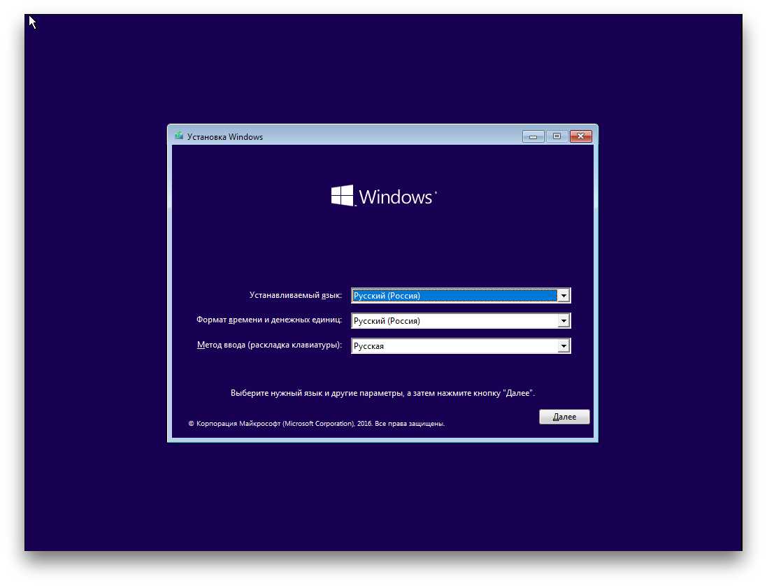 По умолчанию, все уже показывается с русскими настройками, но если нет, то выбираем нужный язык и страну, нажимаем на кнопку «Далее».
