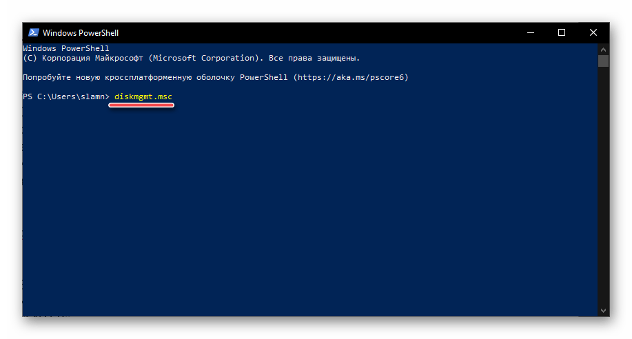 Запустите оболочку PowerShell, например, введя это наименование в поиск, после чего вставьте в открывшийся интерфейс команду diskmgmt.msc и инициируйте ее выполнение нажатием клавиши «ENTER».