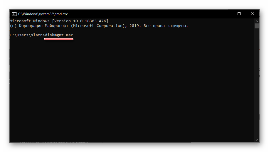 Запустите «Командную строку» (один из наиболее простых способов – ввод и выполнение команды cmd в окне «Выполнить» или использование поиска), вставьте в нее уже знакомую нам по предыдущим способам команду diskmgmt.msc и нажмите «ENTER».