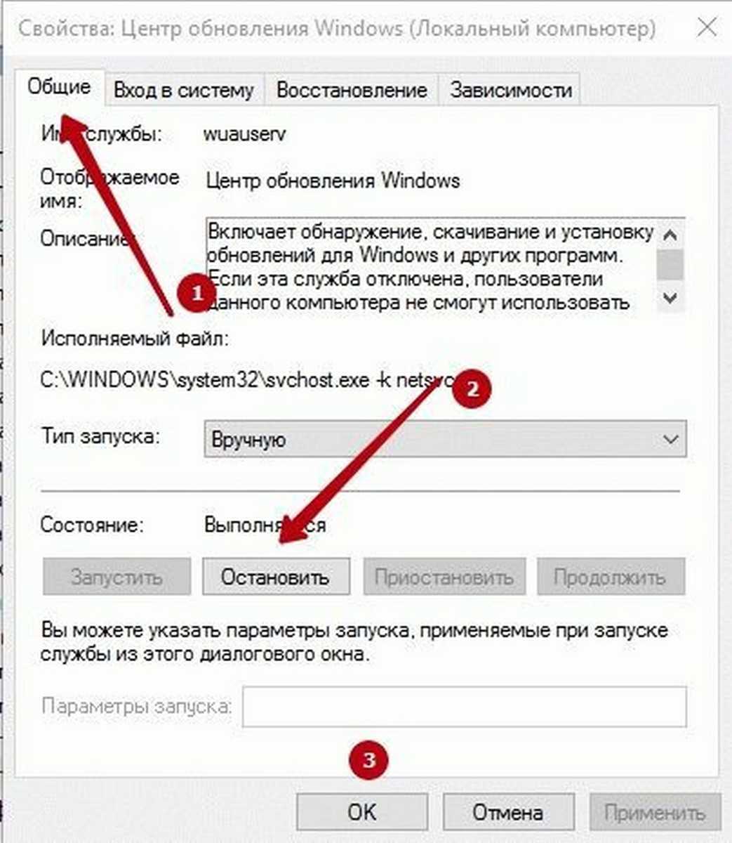 Шаг 3: Во вкладке «Общие», нажмите кнопку «Остановить», и нажмите кнопку «Ок», для остановки службы обновления Windows.