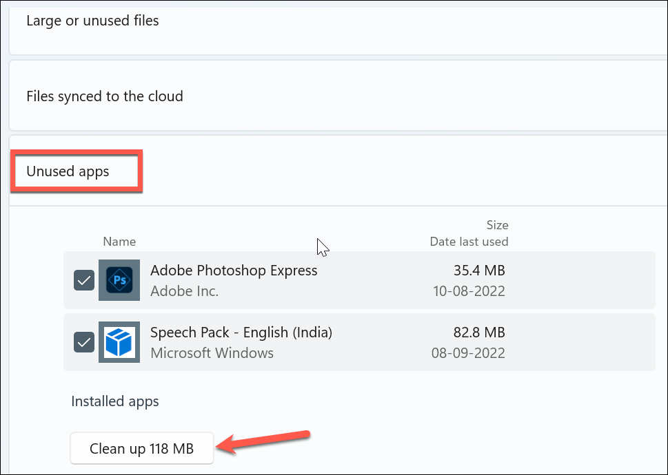 После этого щелкните плитку «Неиспользуемые приложения», чтобы развернуть раздел. Затем, если в списке есть какие-либо приложения, выберите их, установив флажок перед каждым элементом, а затем нажмите кнопку «Очистить», чтобы удалить эти приложения и их данные из вашей системы.
