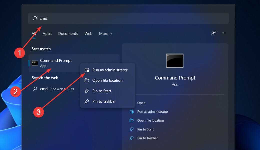 - Tap the Windows key + S to open the search bar, type in cmd, and right-click on the top result and run it as an admin.