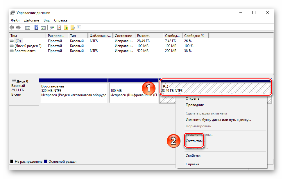 2. Выделите раздел диска C: и через контекстное меню (вызывается правой клавишой мыши) выберите пункт «Сжать том..».