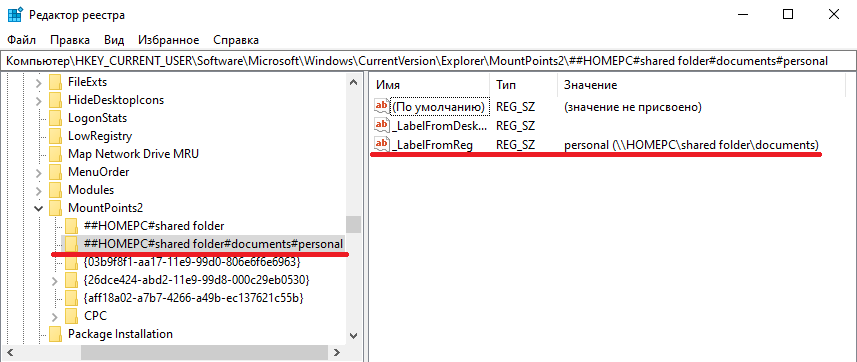 А откуда проводник берет имя диска? Как выяснилось, после подключения сетевого диска в реестре по адресу HKEY_CURRENT_USER\Software\Microsoft\Windows\CurrentVersion\Explorer\MountPoints2 создаётся раздел с информацией о сетевом диске. Имя раздела соответствует сетевому пути, в котором вместо слеша стоит знак решетки. Так в нашем примере имя раздела ##HOMEPС#shared folder#documents#personal. А за имя диска, отображающееся в проводнике, отвечает параметр _LabelFromReg, находящийся в этом разделе.