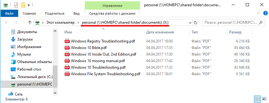 К примеру, есть общая папка ″\\HOMEPС\shared folder\documents\personal″. Когда я подключаю ее как сетевой диск X, то в проводнике она отображается следующим образом.