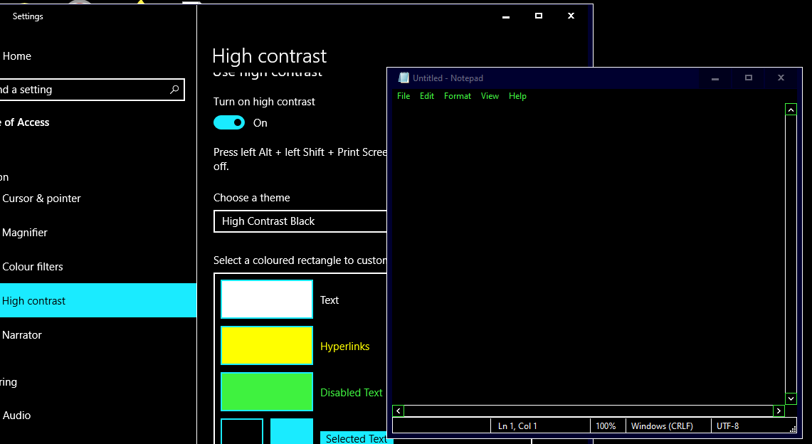 Windows Темная опция 10 для приложений не влияет на Блокнот. Пользователи по-прежнему могут добавлять черный фон в Блокнот, нажав Легкость доступа и Высокая контрастность в настройках и выбрав Активировать высокий контраст > Сверхконтрастный черный варианты. Это, однако, также меняет всю цветовую схему в Windows, что не идеально. Поэтому большинство пользователей, вероятно, предпочтут добавить альтернативные сторонние текстовые редакторы с темными темами в Windows 10 вместо