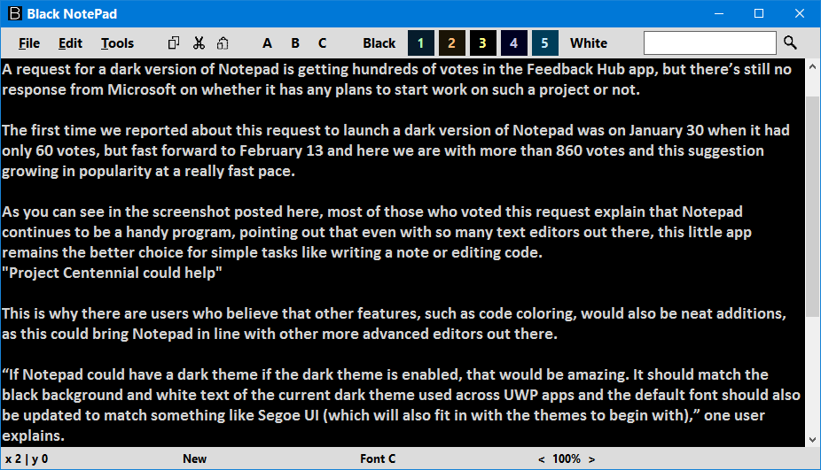 Black NotePad – сторонний текстовый редактор, сохраняющий оригинальные функции Блокнота. Тем не менее, это не то же самое, поскольку он включает в себя дополнительные параметры и функции. Наиболее заметным отличием является его темная тема по умолчанию, которую пользователи могут настраивать, щелкая альтернативные варианты цветовой схемы на своей панели инструментов. Пользователи могут получить этот текстовый редактор, нажав Черный блокнот в их Скачать страницу центра,