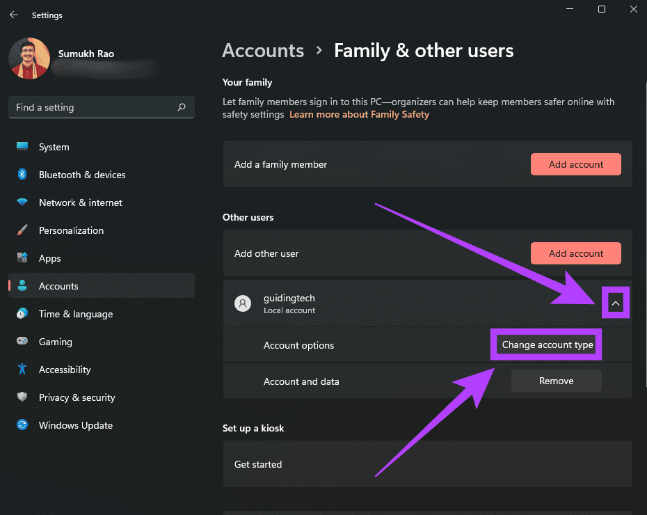 Шаг 8. Ваш новый аккаунт готов. Теперь нажмите маленькую стрелку рядом с новой учетной записью пользователя и выберите Изменить тип учетной записи.
