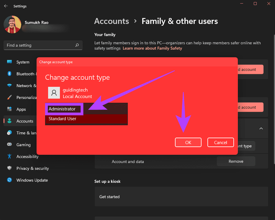 Шаг 9. Выберите «Администратор» в качестве типа учетной записи и нажмите «ОК».