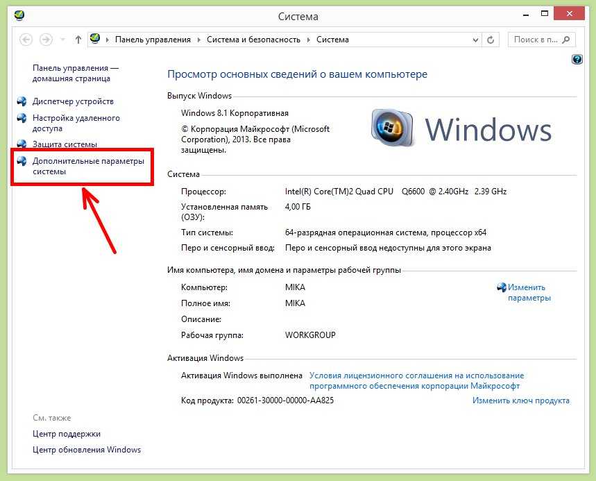 Откроется окошко с основными данными об операционной системе. Обратите внимание на левую часть этого окна. Там нужно будет кликнуть по пункту «Дополнительные параметры системы».