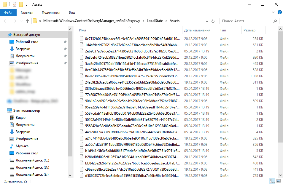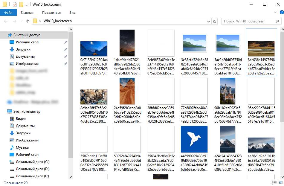 Вот тут и есть наши картинки. Они без «расширения». Чтобы ничего не поломать тут, необходимо выделить все файлы и скопировать в любой другой каталог. Например создать на рабочем столе папку с названием «win10_lockscreen» и скопировать туда все эти файлы.
