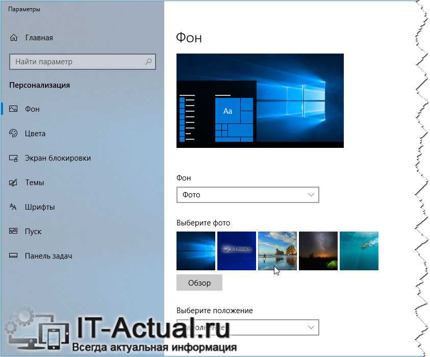 Изменение внешнего оформления Windows 10 происходит через встроенное приложение «Параметры», а именно через раздел «Персонализация». Тут можно не только установить изображение из предложенных системных, но и выбрать любую картинку, хранящуюся на компьютере, а также создать слайд-шоу или включить сплошной цвет из заготовок ОС. Для нестандартного размера файла доступно изменение положения (растянуть, замостить и др.) — это поможет подогнать картинку под размер экрана.