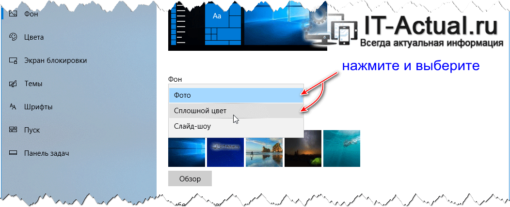 Под пунктом Фон имеется выпадающее меню, изначально там выводится вариант Фото. Кликнув по данному пункту, необходимо выбрать вариант Сплошной цвет.