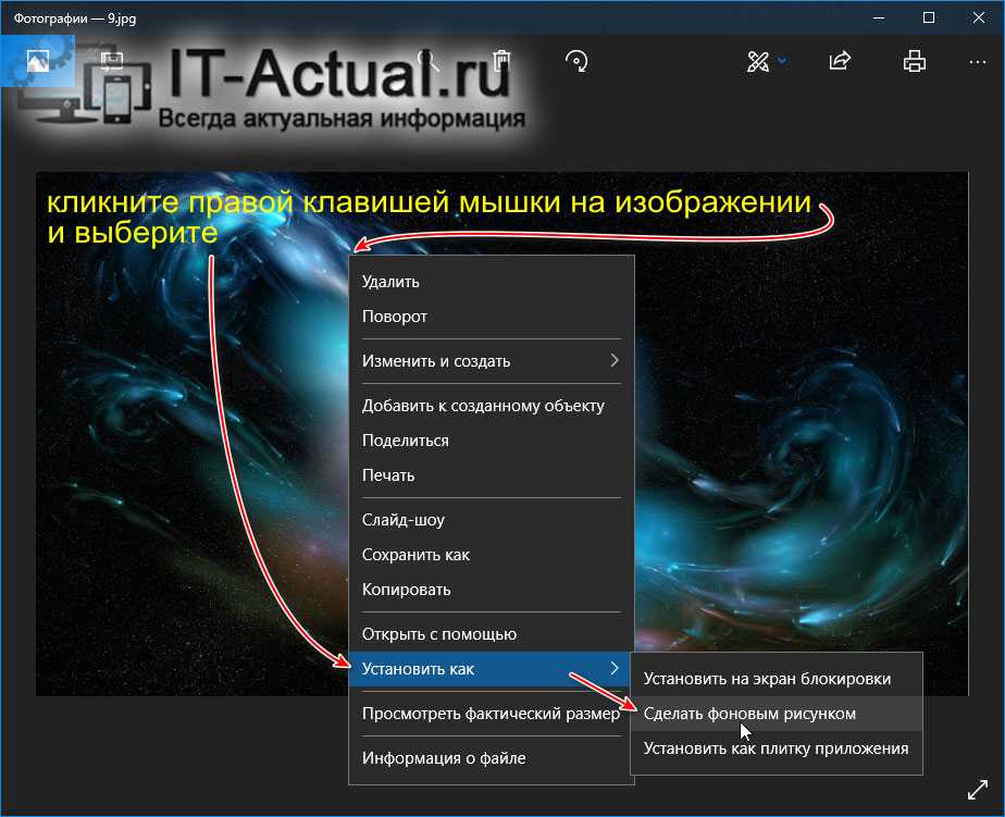 Есть ещё один способ быстрой установки имеющейся в распоряжении картинки в качестве изображения рабочего стола.