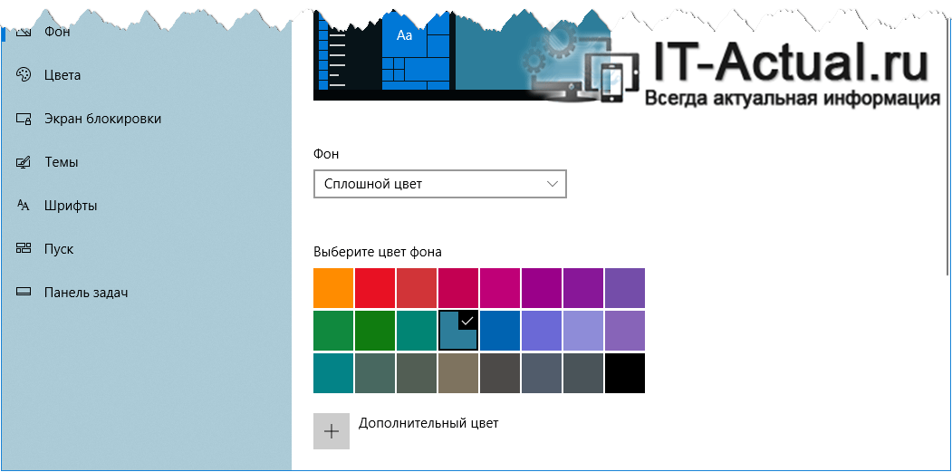 Как только вы это сделаете, фон рабочего стола станет чёрным. Теперь вам останется в том же окне настроек указать желаемый цвет фона из приведённого обширного перечня вариантов. Если вас не устраивает ни один из вариантов, то можно указать и свой цвет, для этого воспользуйтесь кнопкой Дополнительный цвет.