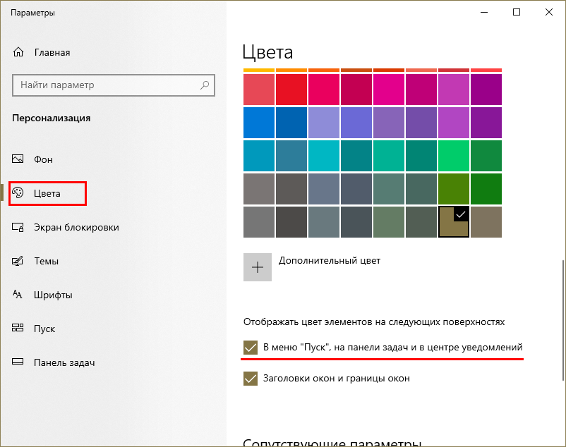Также можно установить переключатель Показать цвет в меню «Пуск», на панели задач и в центре уведомлений в положение Вкл. чтобы меню Пуск, панель задач и центр уведомлений окрасились в выбранный вами цвет.