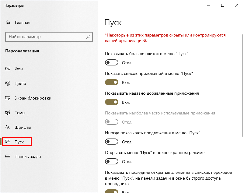 Справа будут показаны настройки меню «Пуск». Семь переключателей: