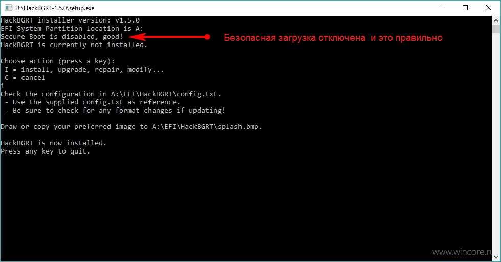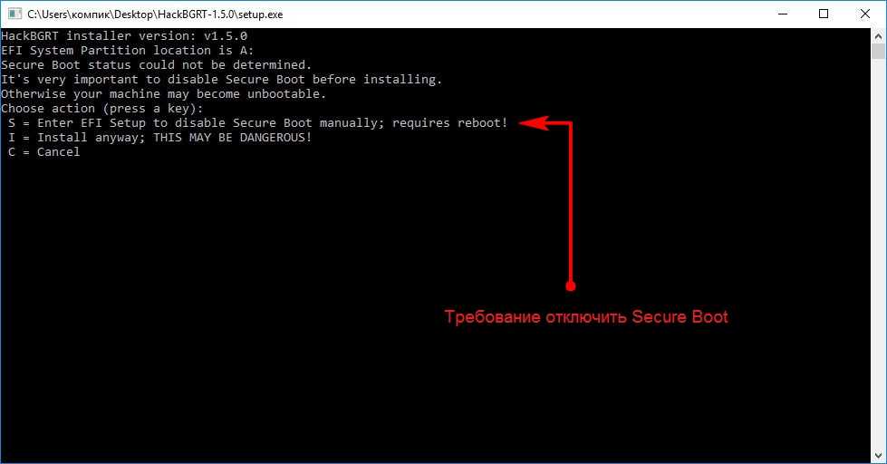 Ключ S указывает на необходимость отключения Secure Boot, I — производит установку каталога утилиты в папку скрытого раздела EFI, С — отменяет действия.